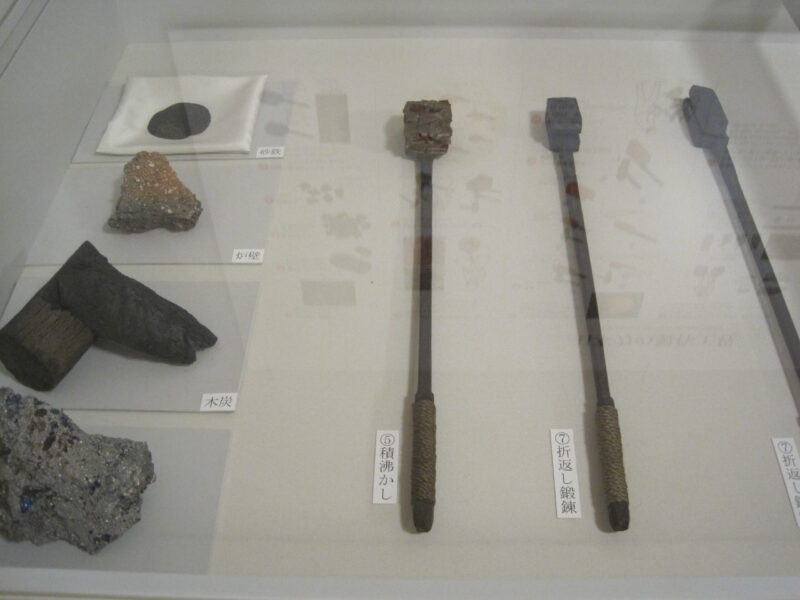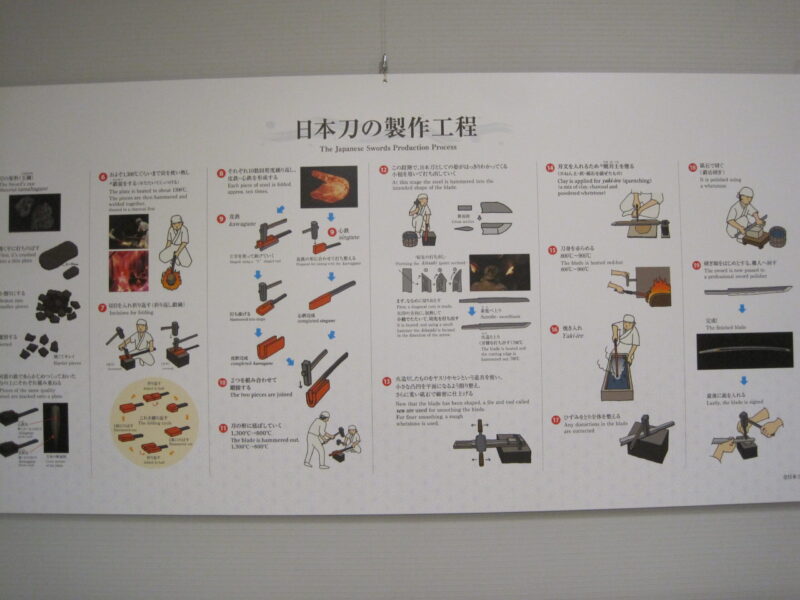 日本刀の美しさは『鍔』の金工デザイン、『地鉄』の折り返し鍛錬の木目模様、『刃文』の波模様、『反り』の美しさ、『柄巻』、『目貫』、『鞘』、一番重要な『玉鋼』など色んな職人が担当し、美しい日本刀が完成
