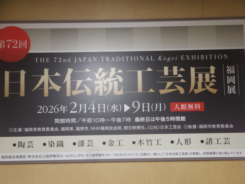 日本伝統工芸展 2026/2/8 日曜日2026/2/7 土曜日nko個人日誌 【第72回 日本伝統工芸展】 昭和29年から毎年一度、福岡は2月に開催している『日本伝統工芸展』 日本の優れた日本伝統工芸の技と美が観れる、陶芸・染織・漆芸・金工・木竹工・人形・諸工芸の7つの部門 人間国宝作品もあります 三越ギャラリーで巡回、開催でした 帰る前に新天町で寿司ランチ
