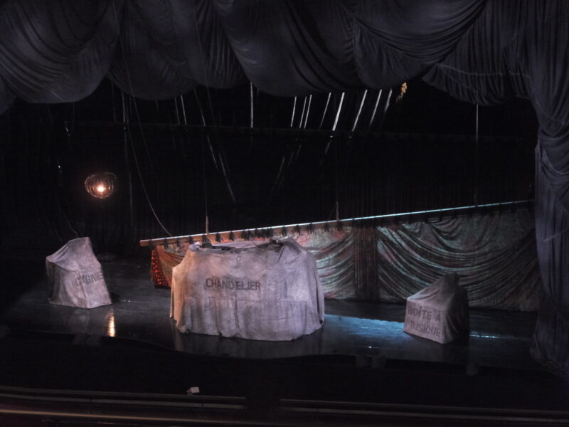 オークション会場から登場する目玉シーンの巨大シャンデリアは重さ400Kg、クリスタルビーズの数3万4000個、どこ席から見ても美しく見える美術スタッフのオリジナルカットクリスタルビーズ